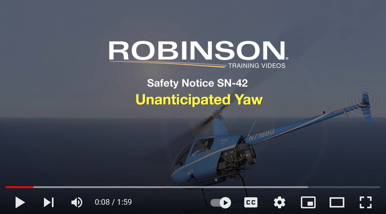 Unanticipated yaw was also the subject of a Robinson Helicopter Safety Notice (SN) published in May 2013: SN-42, Unanticipated Yaw: sn42.pdf (robinsonheli.com), associated to a training video on Robinson Helicopter Company - YouTube: