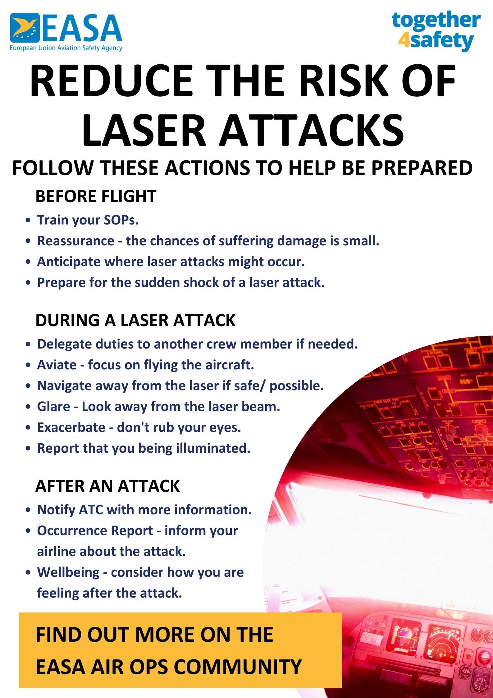 - Learning: Encourage the reporting of all laser strikes and then share this information within your airline and also with your National Aviation Authority to help build up the bigger European and global data picture within the EASA Data4Safety project.