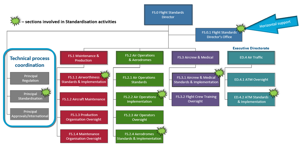 Die mit den Normungstätigkeiten betrauten Mitarbeiter der EASA sind bei der Direktion Flugnormen und der Exekutivdirektion der EASA angesiedelt.