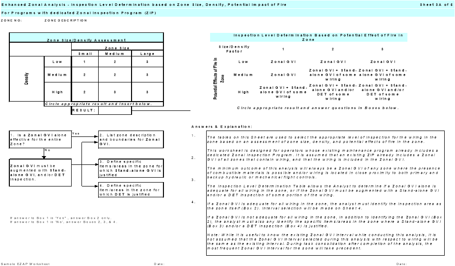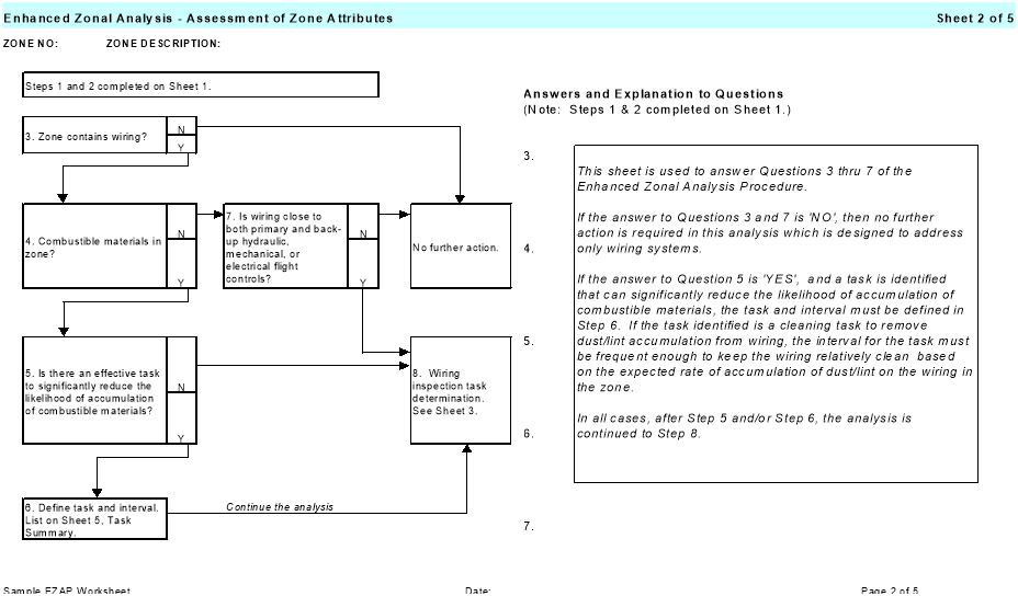 a. Enhanced Zonal Analysis Procedure (EZAP). This AMC presents an “enhanced zonal analysis procedure” and logic that will benefit all aircraft regardless of whether they currently have a structured Zonal Inspection Programme (ZIP), (see Appendix A. Enhanced Zonal Analysis Logic Diagram and Steps and Appendix B. EZAP Worksheets). Application of this procedure will ensure that appropriate attention is given to wiring installations. Using EZAP it will be possible to select stand-alone inspections (either general or detailed) and tasks to minimise the presence of combustible material. The procedure and logic in this AMC complement existing zonal analysis procedures and will also allow the identification of new wiring tasks for those aircraft that do not have a structured ZIP.