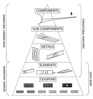 b. The strength of the composite structure should be reliably established, incrementally, through a programme of analysis and a series of tests conducted using specimens of varying levels of complexity. Often referred to in industry as the “building block” approach, these tests and analyses at the coupon, element, details, and sub-component levels can be used to address the issues of variability, environment, structural discontinuity (e.g., joints, cut-outs or other stress risers), damage, manufacturing defects, and design or process-specific details. Typically, testing progresses from simple specimens to more complex elements and details over time. This approach allows the data collected for sufficient analysis correlation and the necessary replicates to quantify variations occurring at the larger structural scales to be economically obtained. The lessons learned from initial tests also help avoid early failures in more complex full-scale tests, which are more costly to conduct and often occur later in a certification programme schedule.