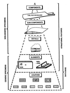 (1) Figures 1 and 2 provide a conceptual schematic of tests typically included in the building block approach for a fixed wing and tail rotor blade structures, respectively. The large quantity of tests needed to provide a statistical basis comes from the lowest levels (coupons and elements) and the performance of structural details are validated in a lesser number of sub-component and component tests. Detail and subcomponent tests may be used to validate the ability of analysis methods to predict local strains and failure modes. Additional statistical considerations (e.g., repetitive point design testing and/or component overload factors to cover material and process variability) will be needed when analysis validation is not achieved. The static strength substantiation programme should also consider all critical loading conditions for all Critical Structure. This includes an assessment of residual strength and stiffness requirements after a predetermined length of service, which takes into account damage and other degradation due to the service period.