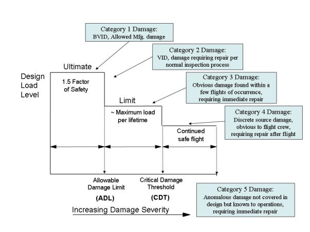 — Composite damage tolerance and fatigue performance is strongly dependent on structural design details (e.g., skin laminate stacking sequence, stringer or frame spacing, stiffening element attachment details, damage arrestment features, and structural redundancy).