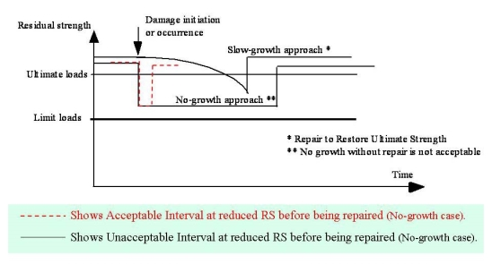 Figure 4 - Schematic diagram of residual strength illustrating that significant accidental damage with “no-growth” should not be left in the structure without repair for a long time.