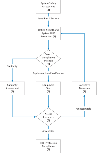 7. If the integrated system tests results (see Step 5) satisfy the pass criteria from 12 GHz to 18 GHz, and design analysis shows that the system has no circuits that operate in the 18 GHz to 40 GHz frequency range, then this demonstrates by analysis that the system is not adversely affected when exposed to HIRF environments above 18 GHz. If these conditions are satisfied, further aircraft and system tests and assessments above 18 GHz are not necessary.