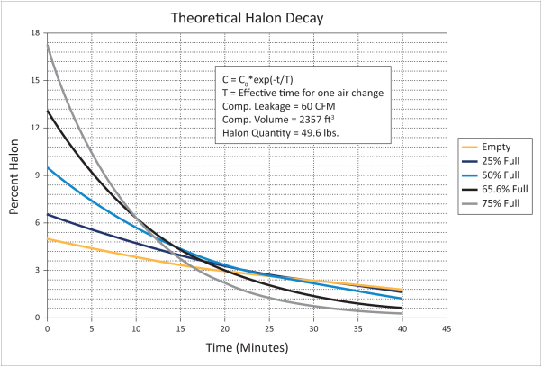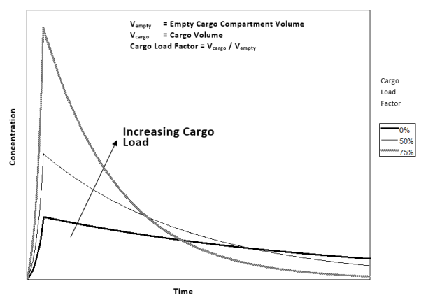 A specific example of the effect of cargo compartment loading is shown in Figure 8-2, using the Appendix 1 simulation. If the volume of the compartment is decreased to represent increasing cargo load percentages and the leakage rate and initial Halon quantity are kept constant, then the initial Halon concentrations increase and the concentration decay rates also increase. Using this approach, the concentration in an empty compartment will decay to 3% faster than a loaded compartment up to a load percentage of about 65.6%. With compartments loaded to a higher percentage than 65.6%, the concentration will fall below 3% faster than an empty compartment.