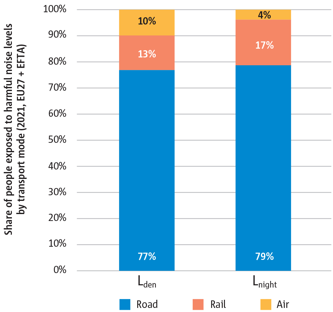 . In terms of the number of people exposed above safe (WHO) guideline values, aviation represented about 10% of the EU27+EFTA population exposed to Lden levels above 45 dB and 4% of the population exposed to Lnight levels above 40 dB in 2021. While this is a smaller share than road and railway, aircraft noise is generally perceived as more annoying than road or railway noise and health effects exist at noise levels around 10 dB lower than other sources